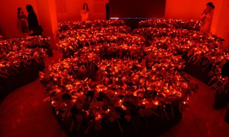 このインスタレーションには、布で作られた手作りのバラが何千本も使われ、それぞれのバラが大量虐殺で命を失った子供たちを表している。これらのバラは、感動的なサウンドとほのかな光に包まれた象徴的な追悼の庭園に姿を変え、来場者を瞑想と郷愁の境地へと誘う。バラ一本一本に、子供の名前と年齢が手書きで書かれたカードが添えられており、希望と平和のメッセージを伝えるアート作品の一部となった失われた魂を誰でも見ることができる。
