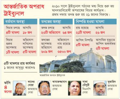 同裁判所がこれまで出した判決は21にのぼるが、うち5件についてはすでに最高裁の上訴局で判決が確定している。これらの裁判の被告のうち、BNPの元幹部サラウッディン・カデル・チョウドゥリとジャマアテ・イスラミの元幹部アリ・アハサン・モハンモド・ムジャヒドの死刑が最近執行され、また同じくジャマアテ・イスラミのふたりの元幹部、ムハンモド・カマルッジャマン、アブドゥル・カデル・モッラの死刑は執行済みだ。またジャマアトの元副党首デロワル・ホサイン・サイディが終身刑となって服役している。ジャマアテ・イスラミの元党首ゴラム・アジョム被告とBNPの元幹部、アブドゥル・アリム被告の場合は、戦争犯罪裁判所で有罪となったあと、上訴局で係争中に死亡したため上告は無効となった。また4つの裁判で被告となったアブル・カラム・アジャド、チョウドゥリ・モイヌッディン、アシュラフッジャマン・カーン、M.A.ジャヒド・ホセン、それにハサン・アリの5人が逃亡中だ。この5人に対しては死刑判決が出ている。すでに上告期限が経過しているので、この5人が逮捕または自首してきた場合には、ただちに刑が確定する。