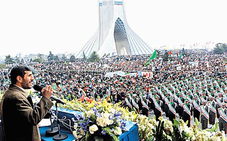 アーザーディー広場で行われた革命記念行進での演説の中で、「敵は実のところ、われわれ国民の偉大さと進歩に憤慨し、不満を覚えているのだ。核エネルギーに関連してわれわれ国民が手にした勝利と進歩が、彼らの今日の不満の原因となっている」と指摘したアフマディーネジャード大統領は、さらに「核問題は、三つのまったく別個の問題からなっている。すなわち、法的問題、技術的問題、そして政治的問題の三つである」とした上で、次のように述べた。