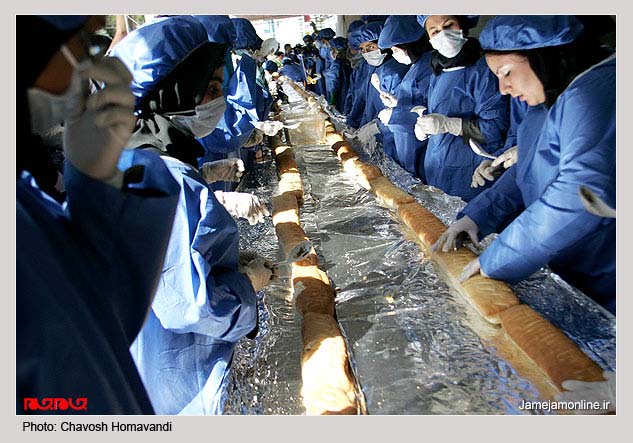 世界最長のサンドイッチが、今朝テヘラン市スポークスマン兼上級顧問のモハンマド・ハーディー・アヤーズィー博士臨席のもと、メッラト公園で調理された。メフル通信によると、全長1500メートルにも及ぶサンドイッチの製作は、今朝8時半からスタートし、「ジャーメ・ジャム向かい」〔テヘラン北部ヴァリー・アスル通り沿いにある地名〕からメッラト公園の中まで続く長さで、植物繊維入りのパンが並べられた後、調理済みのサンドイッチ用具材がパンの中に納められた。