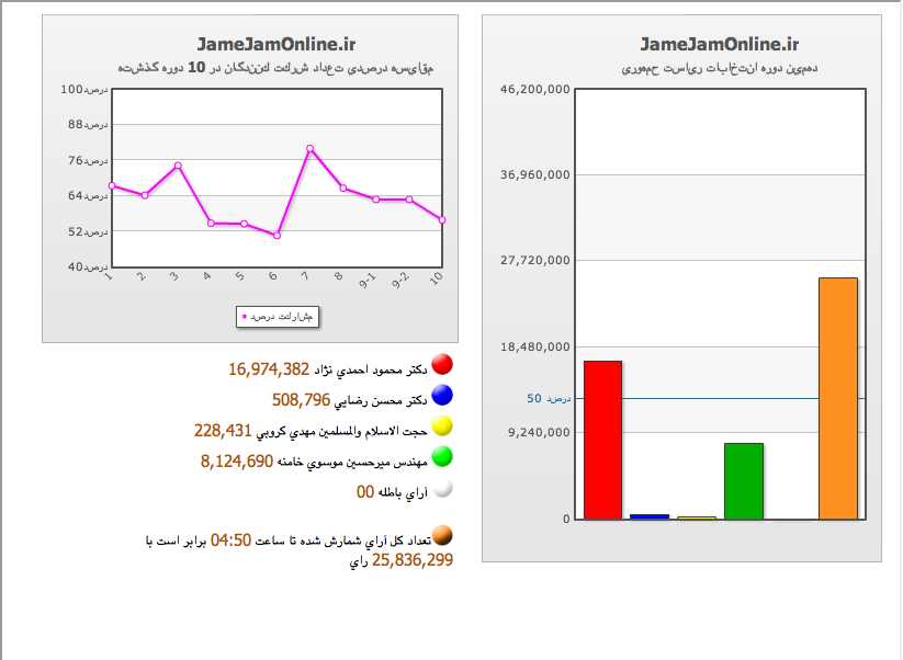ジャーメ・ジャム・オンライン記者の報告によると、カームラーン・ダーネシュジュー選挙本部長は午前5時5分〔日本時間午前9時35分〕記者団の前に姿を現し、午前4時50分までに開票された票数について発表を行うと前置きをした上で、次のように述べた。「これまでに全体で2583万6299票が開票され、アルファベット順に、マフムード・アフマディーネジャード博士1697万4382票、率にして65.69%、モフセン・レザーイー50万8796票、率にして1.96%、メフディー・キャッルービー22万8431票、率にして0.88%、ミール・ホセイン・ムーサヴィー812万4690票、率にして31.44%を獲得した」。
