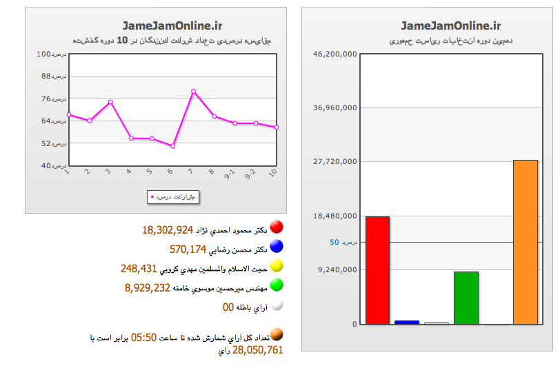ダーネシュジュー本部長はその上で、次のように述べた。「これまでに全体で2805万761票が開票され、アルファベット順に、マフムード・アフマディーネジャード博士1830万2924票、率にして65.24%、モフセン・レザーイー博士57万174票、率にして2.03%、ホッジャトルエスラーム・メフディー・キャッルービー24万8431票、率にして0.88%、ミール・ホセイン・ムーサヴィー技師892万232票、率にして31.83%を獲得した」。