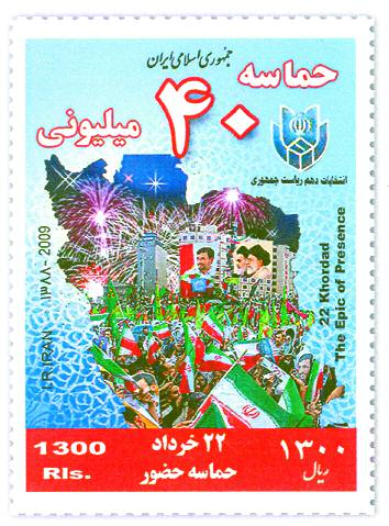 この人物によると、この切手にはイラン地図の内側に配置された様々な人々が、マフムード・アフマディーネジャード氏、イマーム・ホメイニー、及び〔ハーメネイー〕革命最高指導者らの肖像画やイラン国旗を手に持ちつつ、祝祭を開いている様子が描き出されているという。