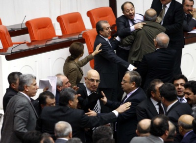 訳者註:こうした騒動の背景には、AKPが進める憲法改正にとって重要とされる改革案の国会審議を遅らせようとする野党側の意図があるとされている。