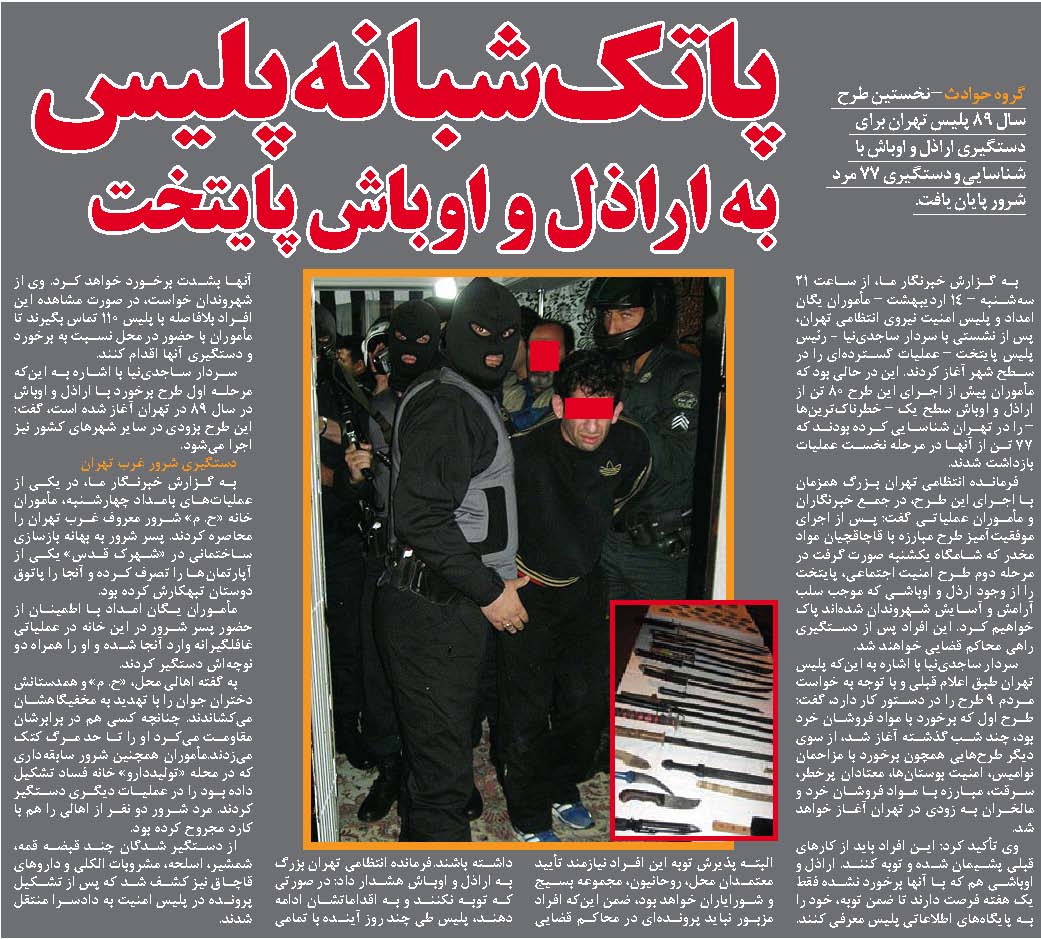 本紙記者の報告によると、テヘラン警察長官のサージェディーニヤー司令官との会議を終えたテヘラン治安維持軍の救援部隊ならびに治安警察の隊員らは、オルディーベヘシュト月14日火曜日〔西暦2010年5月4日〕21時から、大規模な作戦を市内で開始した。隊員らはこの計画を遂行する前に、最も危険であるとされる第一級のならず者ども80名の身元確認をすでに済ませていた。そして今回の第一次作戦で、そのうちの77名を逮捕した。