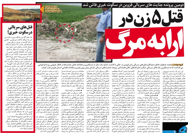 この40歳の男はオルディーベヘシュト月26日〔5月16日〕(日)、警察・司法による大規模な追跡によって逮捕され、火曜日の夜(昨晩)ガズヴィーン州で5人の女性を殺害したことを認めた。他方、犯罪特別チームは、マヒーンによる殺害とされてきた最後の事件の真相についても、今回逮捕された犯人の男の供述の中に含まれていることを明らかにした。
