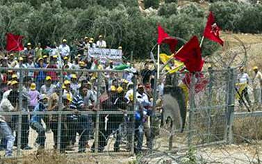 [原文中の写真:占領43周年の日にイスラエル軍の支配するゲート前でデモを行うパレスチナ人たち(西岸地区の村にて)]