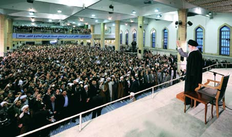 56年バフマン月29日〔1978年2月18日〕に起きたタブリーズ人民による歴史的蜂起の記念日を目前に控えて行われたこの会見において、〔‥‥〕アーヤトッラー・ハーメネイー閣下は、イラン・イスラーム革命のもっとも重要な特徴は、〔世界の〕諸国民にとっての手本を示したことであるとした上で、「イスラーム革命の勝利から今日に至るまでイラン・イスラーム共和国に様々な圧力が加えられてきた真の理由は、イラン国民の偉大なる運動が〔世界の諸国民にとって〕手本となるのを阻止することにあるのである」と指摘した。