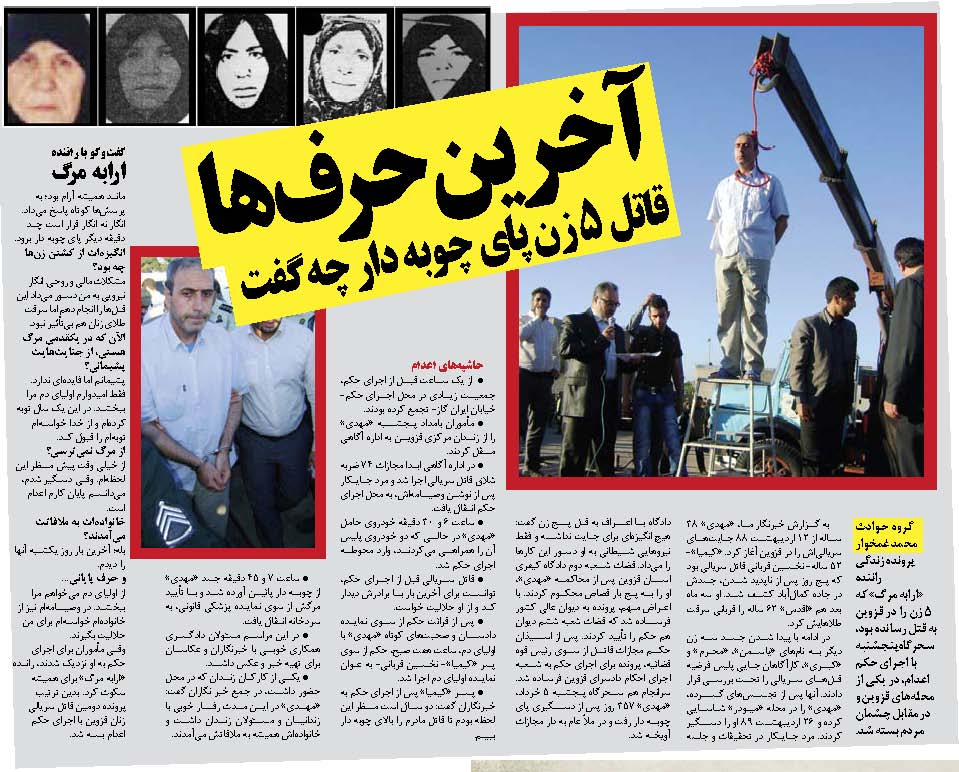 【事件部:モハンマド・ガムハール】5人の女性をガズヴィーンで殺害した「死の馬車」の運転手の《命のファイル》が、木曜日(西暦2011年5月26日)未明にガズヴィーンの某地区で衆人が見守る中で行われた死刑判決の執行により、永遠に閉じられた。