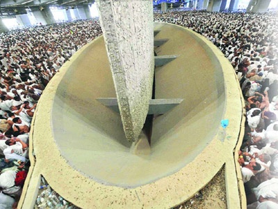 ムスリムたちはラッバイカ(巡礼の最中に唱える言葉)、やタクビール(神は偉大なり)を唱えながら約7~8kmを歩き、ジャムラ(悪魔を象徴する3つの石柱)に辿り着いた。そして大悪魔と見立てられた石柱に向け、7つの石を投げた。(投げられた)一つ一つの石は、悪業を遠ざけることを意味している。
