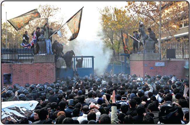 メフル通信の報道によると、昨日午後の集会に参加していた学生らは英大使館の事務棟に入り、英女王の写真の入った額縁を引きずり下ろしたという。学生らはまた、大使館1階にあった一部の書類を外に持ち出し、学生らの前でそれに火を付け、「イギリスに死を」のシュプレヒコールをあげた。その後テヘランの怒れる学生らは英大使館の正門を開け、さらに多くの学生が大使館内になだれ込んだ。この時、現場にいた警察が学生らの侵入を阻止することは、事実上不可能だった。