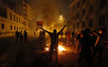 若者たちはムハンマド・マフムード通りに置かれた障壁の一部を破壊し、壁の裏側に抜けてロケット花火に点火する者もいた。また彼らは警官隊に反対するスローガンを叫びながら投石を続け、広場に設けられたスピーカーからは、野戦病院に集まるよう、医師たちへの呼びかけが放送された。