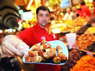 ラマザン月まで1週間を切り、エミノニュで長い歴史をもつエジプトパザールの小売店はラマザン月に向けた準備で賑わっている。イフタールの食事には欠かせない果物であるナツメヤシの実が売場を占め、種類によって1キロ当たり12リラから160リラの価格間で売買されている。