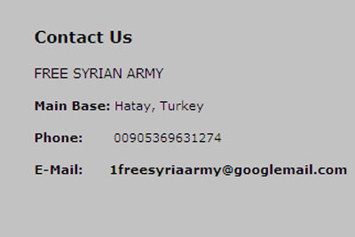 サイトの下に掲載されている「お問い合わせ」の部分が注目される。なぜならばこの部分で、軍の主要拠点は「ハタイ、トルコ」と書かれている一方で、トルコの国内電話番号と「1freesyriaarmy」ユーザー名のe-mailアドレスが記載されているからだ。