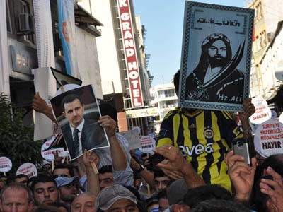 デモの際、アラビア語で「我々の血も命もアサドへ捧げる」「シリア人は孤立していない」というスローガンを標榜した抗議団は、「ファシズムへ対抗して連帯」「シリアでの戦争を望まない」という標語を携えていた。