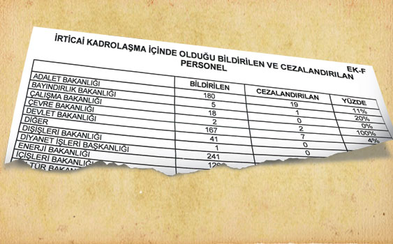 トルコは、エルゲネコン事件の公判で明らかになった文書でとても多くのことを学んだ。受託裁判官が分析した文書の追加11番、12番フォルダにある記録と情報により、参謀本部が「反動分子との闘争」で何を行っていたかが明らかとなった。インターネット覚書(2007年4月27日、大統領選に絡み軍部が警告を発した事件)裁判の重要な証拠もこのフォルダのなかにある。文書ではまず初めに1997年から2001年の間に、年ごとに「反動的な活動の数」と「反動的な発言の数」を示した表を準備していた。クーデターが成功したことを示すために準備したとみられる表では、1997年に246だった「反動的な発言の数」が、2001年に13になっている。これらの年には、発言に反動的な内容が含まれるかどうか調査がおこなわれたが、各省庁に処罰が必要と通告された人々(の数)および彼らに対し行われた措置のパーセンテージが明らかとなった。リストをみると数の点で一番多いのは国民教育省である。反動的であるとして1,479人が告発された。これらのうちの252人が処分された。告発数が最も少ないのは外務省であった。1人が告発されたが処分されなかった。国民保健省では418人が告発された。このうち32人が処分された。県知事、郡長、警察組織を管轄する内務省は、2月28日過程(軍部)が最も苛立ちを募らせた省庁である。参謀本部は、ここでは532人を処分することを求めた。手元にある資料によると、内務省で処分された職員数は15人と記録されている。環境省では、2人の職員を処分するよう通達された。この二人とも処分されたので、成功率100%と書かれていた。このリストは直接参謀本部が(各省庁の)上層部を狙って作られたリストである。この過程に関与した、中下層クラスの多くの役人の処分を、別のデータとして心に留め置くことも有用である。