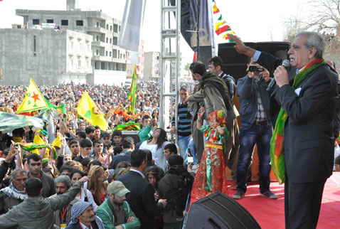 平和民主党(BDP)バトマン選出国会議員のアイラ・アカト氏はクルド語でのスピーチで、クルド人は100年もの間立ち上がっていたと話した。そして以下のように語った。「2006年に“もう十分だ”、2012年には“自由か、または自由か(自由しかない)”と言った。政治家たちは今年イムラル島を訪れた。これらは一つ一つがステップとなっている。我らはこの国家を知っている。我らがクルド人は常にその闘いで、知れ渡っている。DTKアフメト・チュルク共同議長と共に少し前我々が訪れたアブドゥッラー・オジャランは私たちに、『民衆はどうしているか。今も立ち上がっているか?』と尋ねた。次の問いはクルド人の団結に関してであった。さらにクルド人によろしく伝えるようにと求められた」