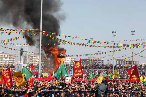アブドゥッラー・オジャランがイムラル島を訪問した一団に託した手紙は、今日ディヤルバクルでネヴルーズを祝うために集まった民衆に対し、クルド語とトル コ語両方で代読された。オジャランは、手紙の要点として、「武器は手放し、民主的な政治プロセスを始めるように」と呼びかけた。