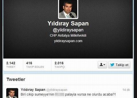 CHPのアンタルヤ選出議員であるユルドゥライ・サパン氏はナタで人を襲った犯人が釈放されるのを非難する際、レジェプ・タイイプ・エルドアン首相の娘シュメイイェさんを引き合いにだし、下品な表現を使った。CHPのサパン氏はツイッターで、ゲズィ公園デモ参加者らをナタで襲い、世間で「ナタ襲撃者」として呼ばれているサブリ・チェレビ氏が裁判所により釈放され、モロッコへ行くことを非難する際、レジェプ・タイイプ・エルドアン首相の娘シュメイイェ・エルドアンさん引き合いに出した。