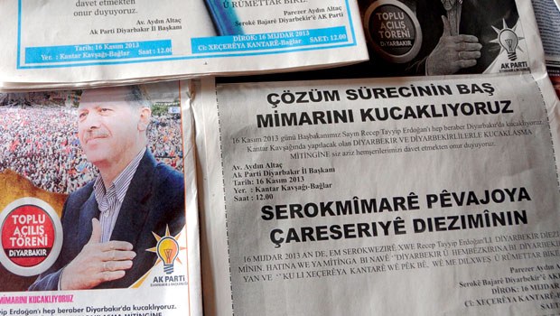 タイイプ・エルドアン首相の11月16、17日のディヤルバクル(訪問)プログラムについて、AKPのディヤルバクル県本部は町の掲示板や地方新聞へ告知を掲載することを始めた。地方新聞には、トルコ語とクルド語による「解決プロセスの主導者をあたたかく迎えよう」との見出しの告知でで、ディヤルバクルの住民は全体開会式典に招待された。クルド語の告知では、民主化法案により禁止を撤廃された‘w’ と‘x’の文字も使用された。AKPディヤルバクル県本部は、トルコ語とクルド語とともにザザ語でも新聞告知を行う準備をしている。