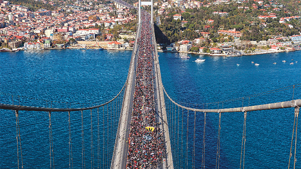 今年で35回目を迎えるイスタンブル・マラソンだが、橋での光景はさながらカーニバルであった。晴天も手伝ってマラソン大会の中で開催された市民ウォーキングには10万人以上のイスタンブル市民が参加し、橋ではランナーではなくメッセージを伝えようとする人々が競い合った。橋の両方向で右車線は安全上の理由のため閉鎖されたが、イスタンブル市民が「走っていない」にもかかわらず橋が揺れた。アジア側から始まってヨーロッパ側でゴールに達するイスタンブル・マラソンのスタート地点となったアルトゥニザーデに最初に並んだのはアスリート達であった。カーディル・トプバシュ広域市市長のスタートの合図で、42キロ、15キロ、10キロのコースを走り始めたアスリートらに続いて、橋がイスタンブル市民に開放された。再びトプバシュ市長のスタートの合図で、市民はグループを組んで大陸間ウォーキングを開始した。