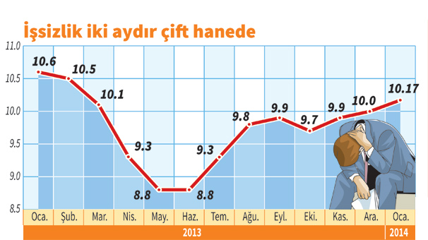 1月の失業率は、12月に比べ0.1ポイント上昇し10.1%となった。季節労働調整後の失業率は9.1%となった。トルコ統計機構のデータによれば、失業率は2013年1月に比べ0.5ポイントの減少が見られ、農業以外の失業率は12.3%となった。