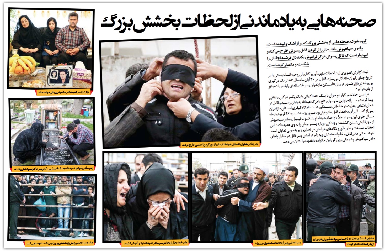 マーザンダラーン州の刑事裁判所はその6年後、殺人犯に死刑を言い渡し、今年のファルヴァルディーン月26日〔4月15日〕(火曜日)、この男は公開で処刑されることになった。しかしサッカーの指導者〔である殺された少年の父親〕と喪服の母親は、自分たちの法的権利〔※〕を放棄、この若い男にもう一度生きるチャンスをプレゼントしたのであった。