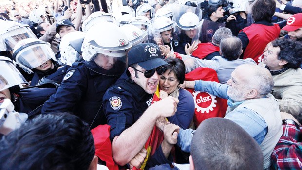 トルコ革新労働組合連合(DİSK)、公務員組合連合(KESK)、トルコ技術者建築家会議所連合(TMMOB)、トルコ医師連合(TTB)が設立した 2014年5月1日委員会がタクスィム・ヒルホテルで開催されたマルマラ地方代表者会議ののちゲジィ公園の入り口で行う予定だった記者会見は警官によって妨害された。会議が行われたホテルの前で決起した人々と労働者たちを押しやった警官は、その場にスプレーで3回ガスを噴射してばらばになったグループから9人を逮捕した。介入の際に北イラク地域のテレビ局ルダヴTVのカメラマン、ハルン・ウシュクさんが体調を崩した。心臓発作が疑われたハルン・ウシュクは救急車で病院に搬送された。