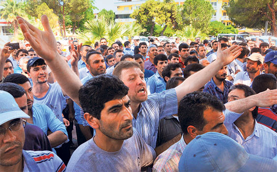 301人の炭鉱労働者が命を落としたソマにおいて昨日緊張が高まった。労働条件の改善と労働の安全性を確保するために行動を起こした500人の労働者たちは炭鉱労働組合の委員の辞任を求めた。エーゲ地方支部に向かって行進した労働者たちが建物に入ろうとすると騒ぎが起こった。警官一人が負傷した事件で、 まずエーゲ地区鉱山労働者組合会長のタメル・キュチュクゲンジャイ、そのあとに5人の運営委員が辞任した、さらにのちにエーゲ地方褐炭事業局に向かい行進した炭鉱労働者たちは局長のハック・ドゥラルの辞任を訴えた。機動隊の護衛をうけて事件現場に向かったソマ郡知事バハッティン・アトゥチュが調査をおこなっている監査官たちが「許可」を出すまで炭鉱には入山できないと述べると、労働者たちは解散した。炭鉱労働者のムスタファ・アクプナルは、組合メンバーの1、2人の辞任が問題を解決しないこと、全員が職務を離れることが必要だと述べた。セザイ・ユルドゥルムは「組合は全く私たちの側ではありませんでした。私たちを死に追いやったのです。労働者の権利を守ってくれる組合を求めます」と話した。この間にソマ石炭採掘A.Şを代弁してグループ長が携帯電話のメッセージでおこなった「仕事開始」の呼びかけにはどの労働者も応えず、会社に属する他の2つの炭鉱のうちアタ・バジャス炭鉱が無期限閉鎖された。