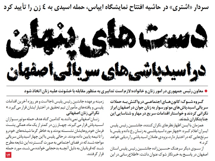 エスファハーンの女性たちは、どのような罪を働いたら、オートバイに乗った酸かけ魔の襲撃の標的となるのか、見当もつかない状態に置かれている。4人の女性たちはここ1ヶ月弱の間に〔襲撃されており〕、彼女たちは皆、車の運転席に座っていた。彼女たちはまた、暑かったために車のウィンドウを半分近く開けていた。警察が4件の連続酸通り魔事件に直面する中、〔フェイスブックのような〕ソーシャルな空間では、被害者たちはバッドへジャービー(ヘジャーブが乱れた状態)だったとされていることが原因で襲撃されたのではないかとの噂が、広範囲にわたって取り沙汰されている。