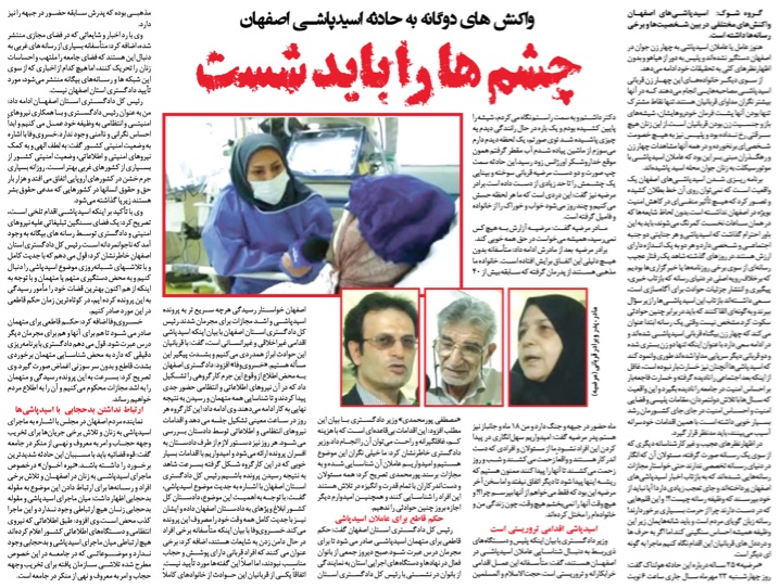 エスファハーン州司法局長は、酸を人にかける行為は非倫理的・非人道的行為だと指摘した上で、さらに「この事件の被害者たちには、同情の念を表明する。この事件の真相解明に向けて、鋭意努力していく」と語った。〔…〕