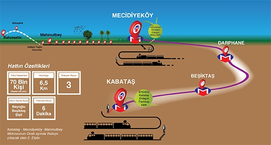 イスタンブル広域市報道顧問から行われた発表によると、1月に予定されている入札の後、カバタシュ―ベシクタシュ―ダルプハーネ―メジディエキョイの路線が3つの駅を伴い運行を開始する。さらに、長さ6.5キロメートルの新路線の建設作業に早急に着手することが目標にされている。
