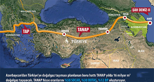 アゼルバイジャン産の天然ガスをトルコ経由からヨーロッパに輸送するTANAPの着工が今日、レジェプ・タイイプ・エルドアン大統領、アゼルバイジャンのイルハム・アリイフ大統領、グルジアのギオリギ・マルグヴェラシュヴィリ大統領の参加の下、カルスで始まった。プロジェクトは1000万ドルを要すると見込まれている。