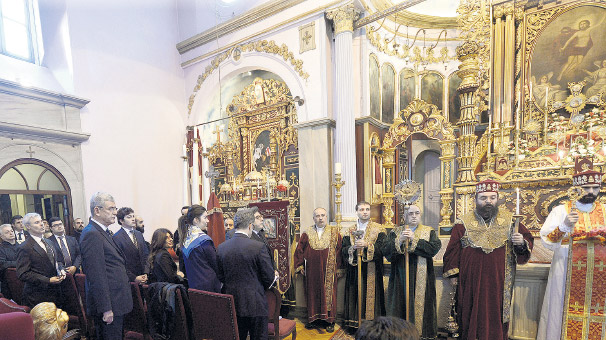1915年4月24日にイスタンブルで著名なアルメニア人記者や作家、医者、芸術家を含む知識人たちが逮捕されたために、1915年の事件の始まりとされるこの日に行われたいくつかの追悼式典の一つが、アルメニア総主教座によってクムカプ・聖母マリア教会で開かれた。この追悼プログラムにはEU担当相で首席交渉官 のヴォルカン・ボズクル氏が教会の特別な招待客のために設けられたスペースで参加した一方、ヴァルソロメオス・コンスタンティノープル全地総主教やトルコ・ユダヤ・ラビ長のイスハク・ハレヴァ氏、アメリカの在イスタンブル総領事のチャールズ・ハンター氏の他、多くの外国人使節が参加した。イスタンブル県から体調不良のイスタンブル・アルメニア総主教メスロプ・ムタフィヤン氏の代わりに任命されたトルコ・アルメニア総主教代理のアラム・アテシヤン氏が執り行った式典では、平和と兄弟愛が強調され、式典の最後に子供たちが平和の鳩を飛ばした。アテシヤン氏は式典の終わりに1915年の事件で亡くなった人々を追悼する談話で、 「トルコのアルメニア人はこの国に欠かせない、忠実な構成要素だ。国民としての責任を良く理解している。報復主義的アプローチには意味がない」と述べた。アテシヤン氏はチャナッカレの戦いから100周年についても触れ、「心からの祈りをチャナッカレの戦いで亡くなったオスマン軍の兵士たちの安らかな魂の眠りのためにも捧げます」と述べた。式典のために教会を訪れた人々は「アーメン」と言ってこの祈りに参加した。アテシヤン氏の話の後、レジェプ・タイイプ・エルドアン大統領が 送ったメッセージがタトゥル・アヌシュヤン修道院長によって読み上げられた。エルドアン大統領のメッセージは下記の通りだ。