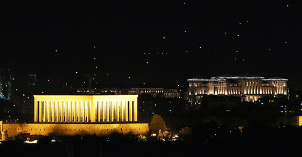 チャナッカレ戦勝記念の一環として、アタテュルク廟で昨晩セレモニーが行われた。アナトリア通信カメラマンが、その夜に撮影したこの写真は、セレモニーの様子を写しただけでなく、長い間変化していなかったアンカラのシルエットが新しくなったことも示していた。