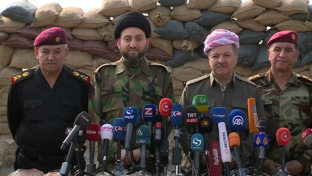 イラク・クルド自治政府のマスード・バルザーニー大統領は、シーア派国家連合のリーダーであるアマル・アル=ハキムとともにモースルで記者会見に臨んだ。