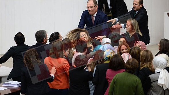 AKPとHDPの女性議員らの間での議論も激化し、諍いが生じた。AKPのギョクチェン・オズドアン・エンチ議員は、HDP議員に蹴りを入れ、レイラ・ビルリキ議員やブルジュ・チェリキ議員と髪を掴み合っての喧嘩になった。