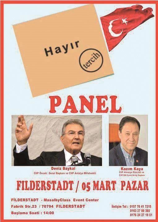 バイカル元党首は、3月5日日曜日14時にシュトゥットガルト近くのフィルダーシュタットで行われる予定だった国民投票に関するパネル討論会に出席することが発表されていた。また、ボズダー法務大臣、ゼイベクチ財務大臣のプログラム出席が認められるために、デニズ・バイカル元党首がドイツでのプログラムをキャンセルしたことを、CHP独支部広報出版ソーシャルメディア責任者のハイリ・チチェキダー博士が発表した。
