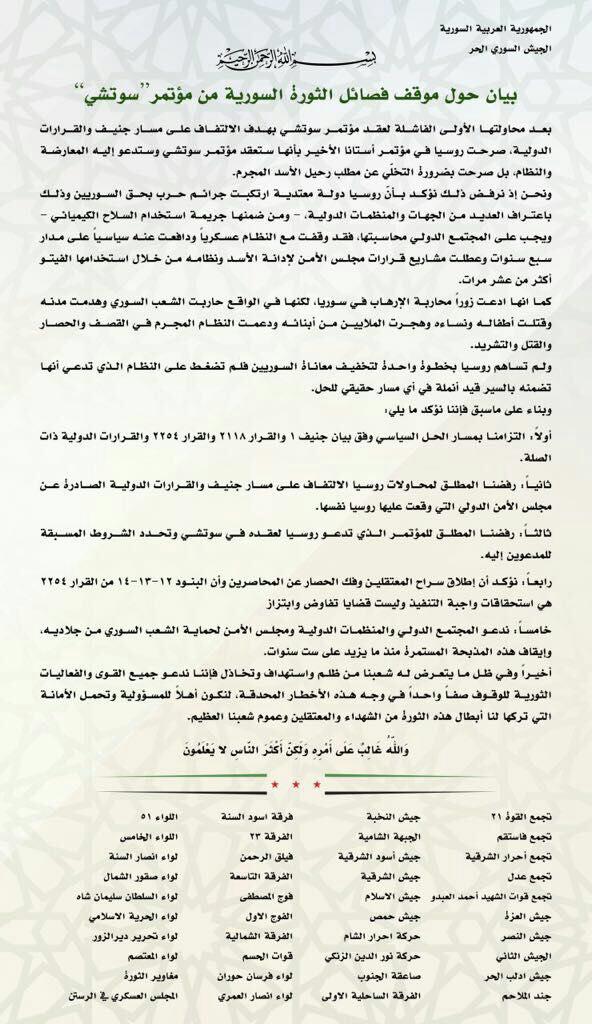 シリア:国内で活動を続ける主要な反体制武装集団40組織はソチでのシリア国民対話大会(シリア諸国民大会)を「断固拒否」