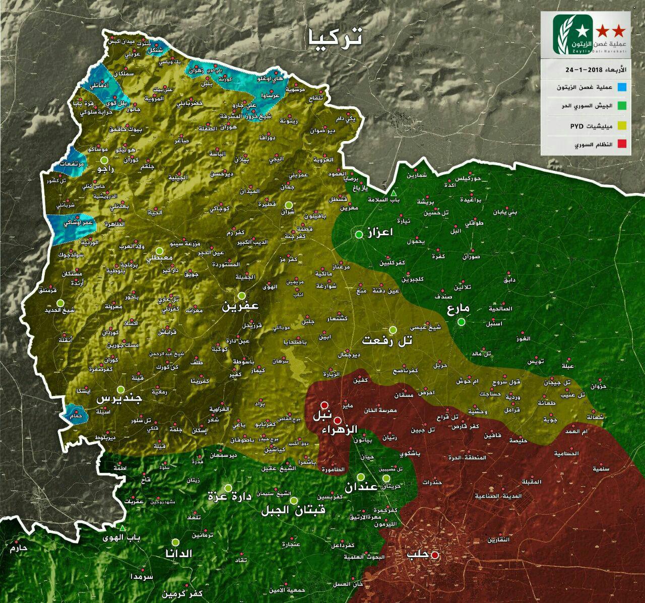■ロシア軍は、シリア軍駐留に向け、トルコ軍が掌握を目指すロジャヴァの拠点都市タッル・リフアト市(アレッポ県北西部)から部隊を撤退(2018年1月25日)