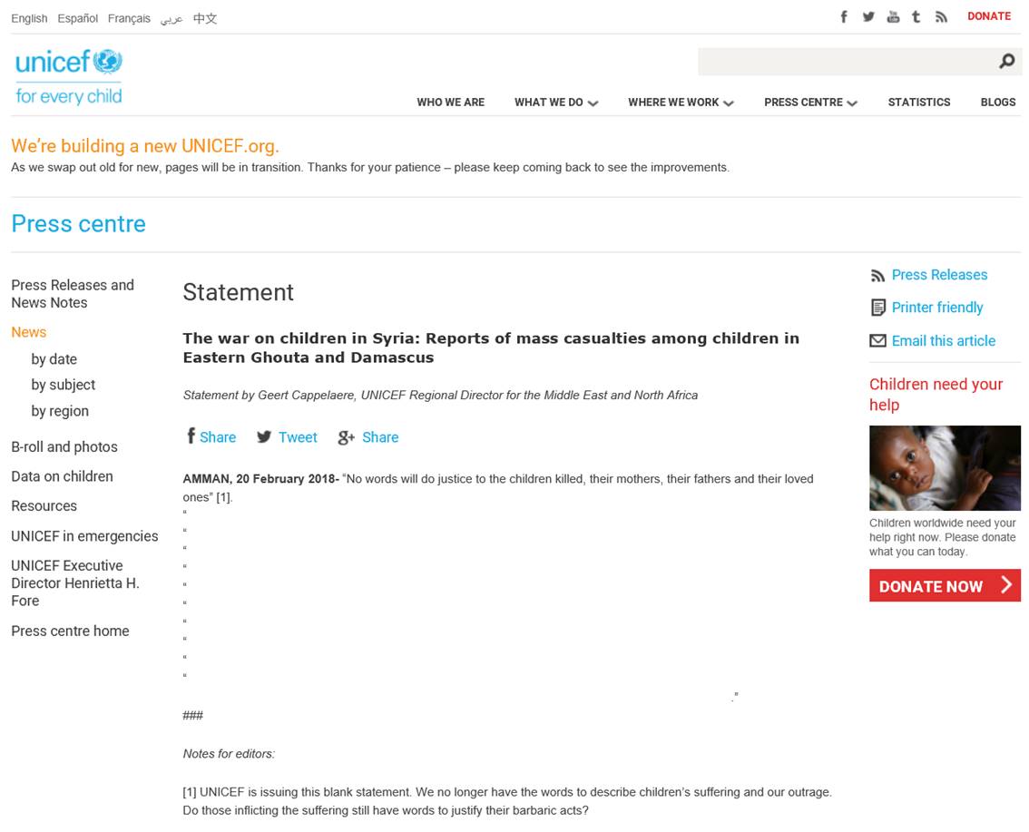 ■UNICEFは白紙の声明で東グータ地方での爆撃・砲撃に抗議(2018年2月20日)