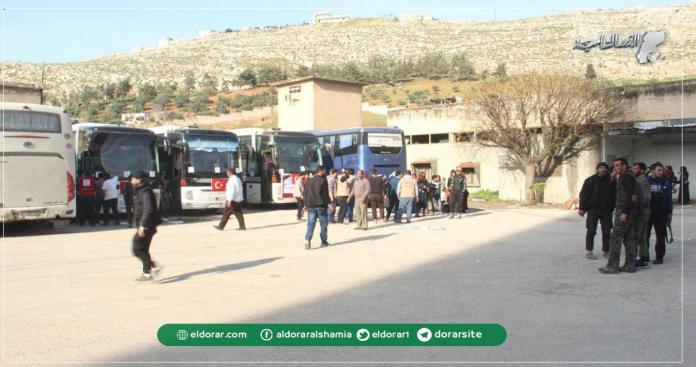■シリア軍が首都ダマスカス南部のダーイシュ拠点への攻勢を強めるなか、戦闘員と家族1,055人がバスでイドリブ県、アレッポ県ジャラーブルス市に退去(2018年3月13日)