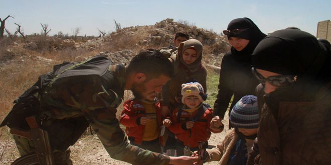 ■イスラーム軍支配下の東グータ地方から女性、子供、老人、患者40人が前日に引き続きシリア政府支配地域に退去(2018年3月14日)