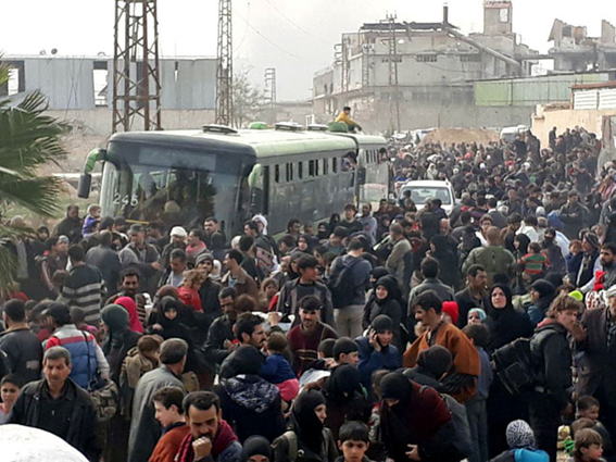 ■イスラーム軍の支配下にある東グータ地方ドゥーマー市からも住民数千人がシリア政府支配地域に退去(2018年3月15日)