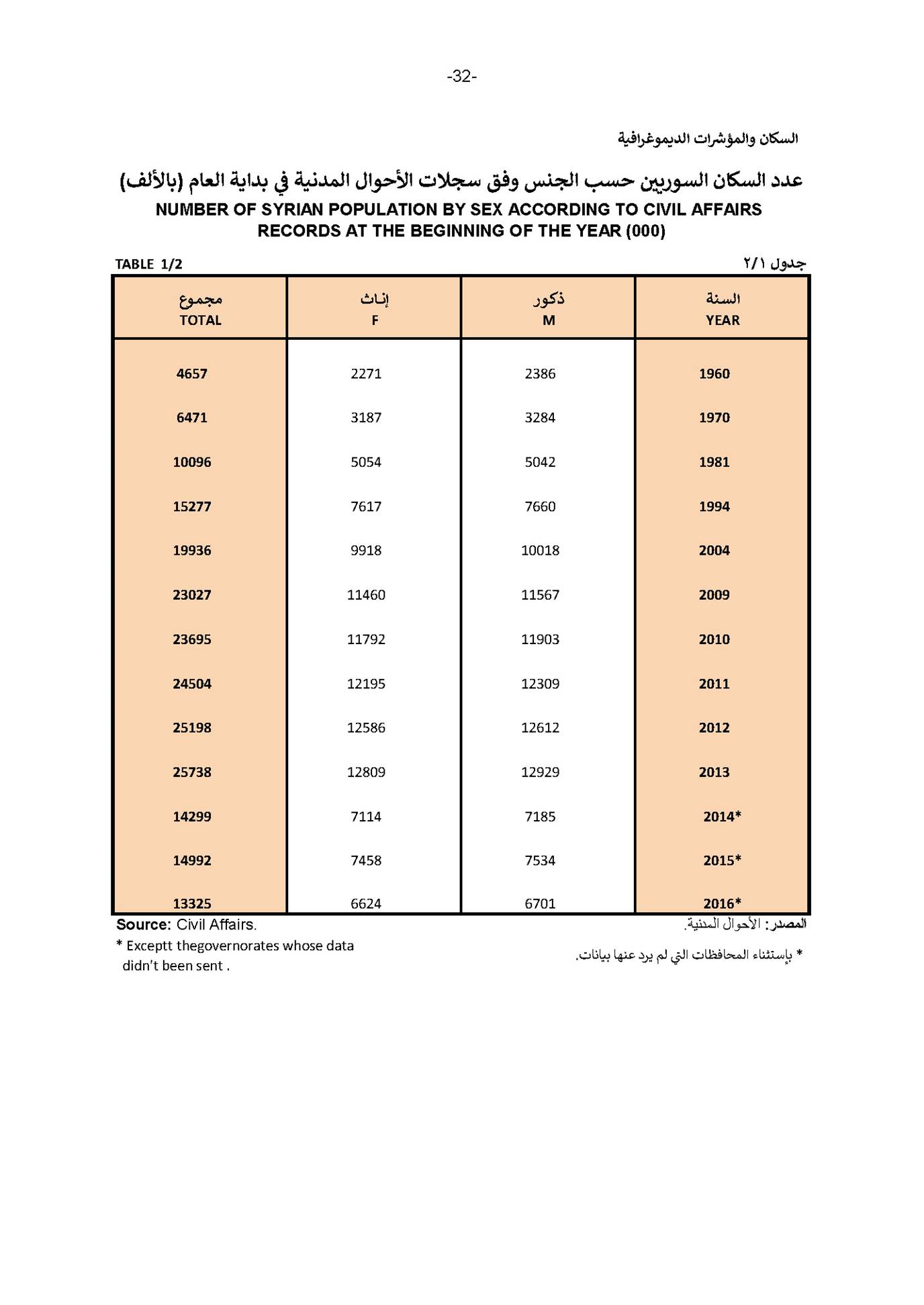 シリア:統計局は『年間統計集(2017年版)』を発表:シリア国内総人口は2011年より320万人減少の2129万人