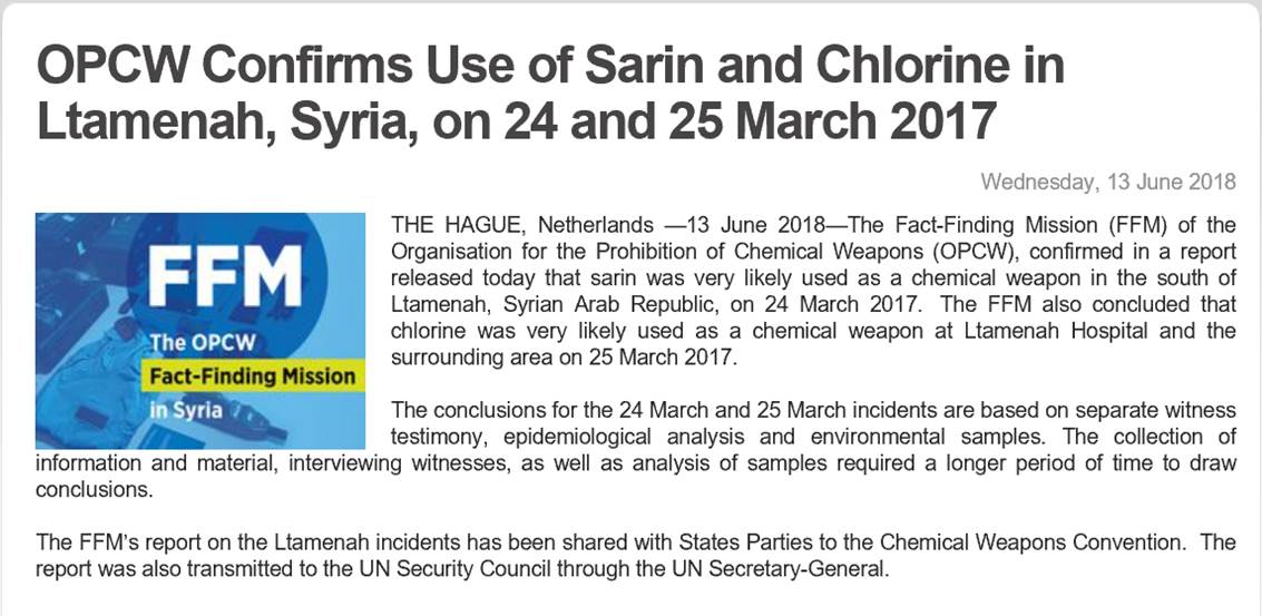 ■OPCWは2017年3月にハマー県での戦闘でサリン・ガスと塩素ガスが使用された可能性が非常に高いと結論づける(2018年6月13日)