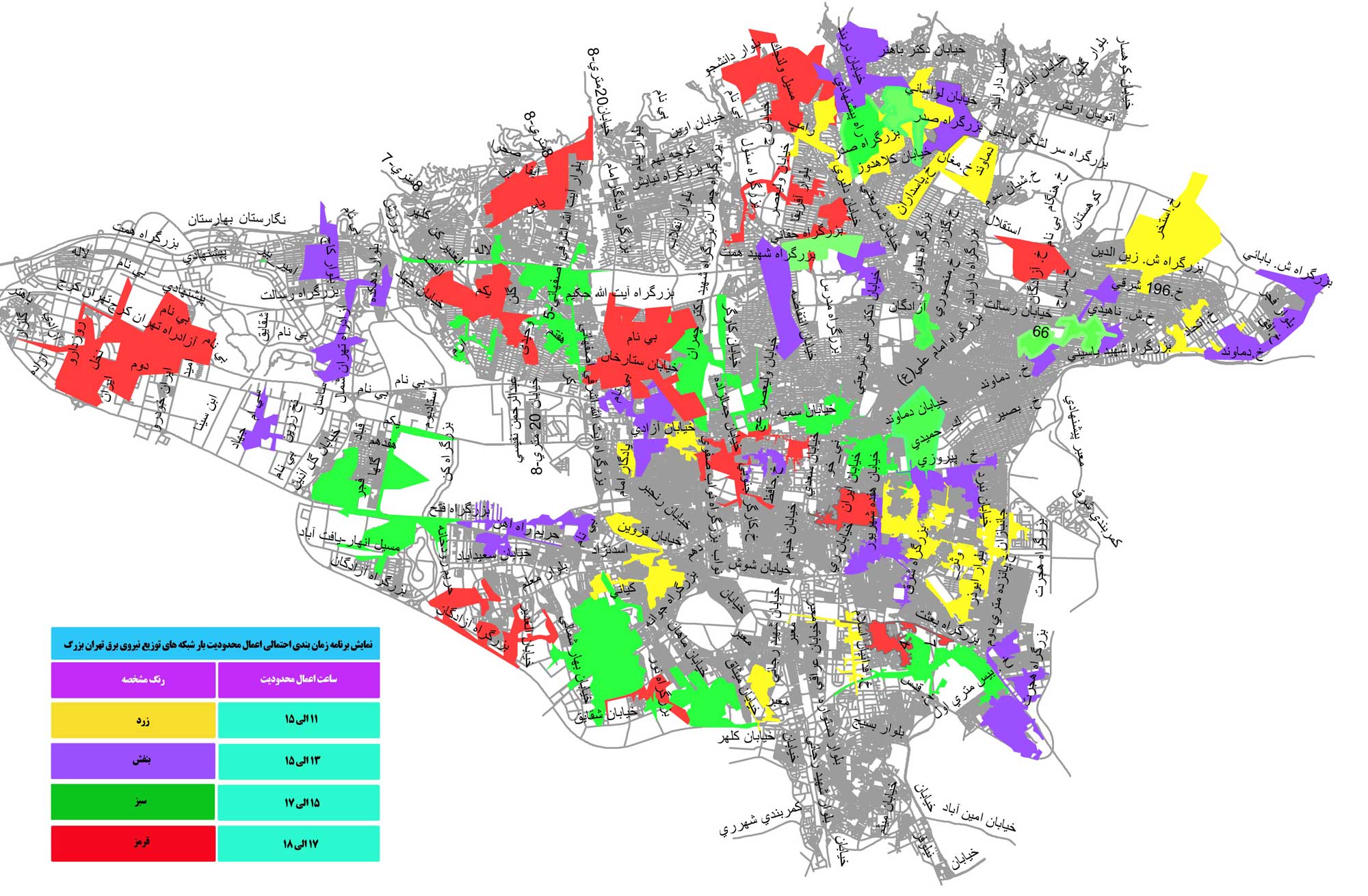 この計画停電計画に基づけば、テヘランで計画停電が実施される時間帯は、11時から15時、13時から15時、15時から17時、17時から18時となる。当該時間帯に、計画停電が実施される予定の地域は、テヘランの地図上でそれぞれ異なる色で示されている。