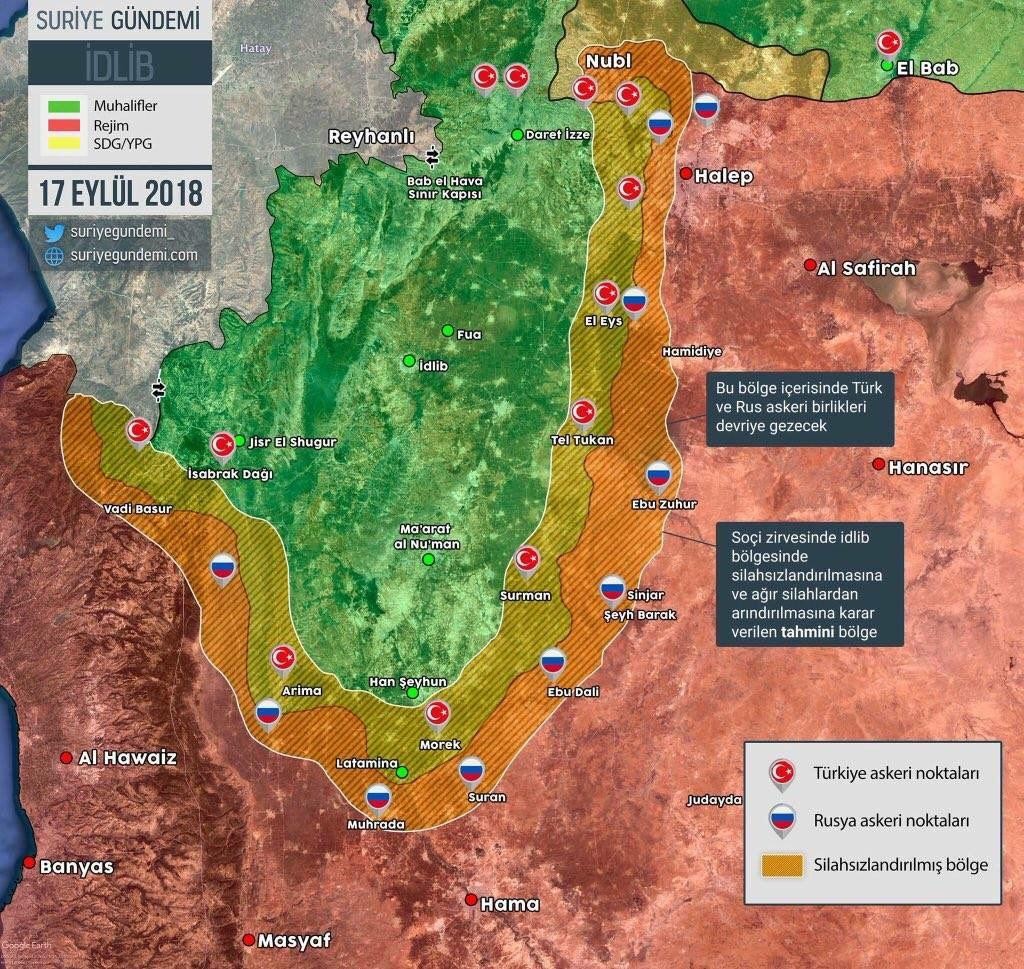 ■ロシア・トルコ首脳会談によりイドリブ県総攻撃はひとまず回避:非武装地帯設置、同地帯からの反体制派の排除、両軍の連携パトロール、アレッポ市・ハマー市・ラタキア市街道再開で合意(2018年9月17日)