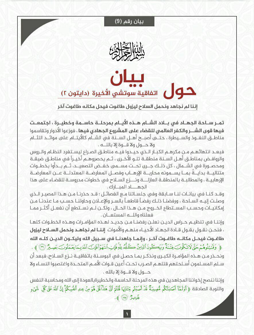 ■新興のアル=カーイダ系組織のフッラース・ディーンはロシア・トルコ首脳によるイドリブ県での非武装地帯設置合意を拒否(2018年9月22日)