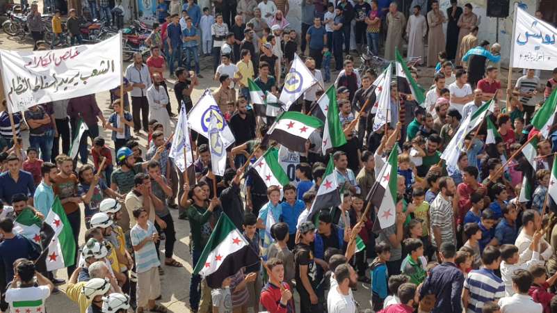 ■シャーム解放機構はロシア・トルコ両首脳による非武装地帯設置合意への拒否の意思を表明するデモ行進を行う(2018年10月18日)